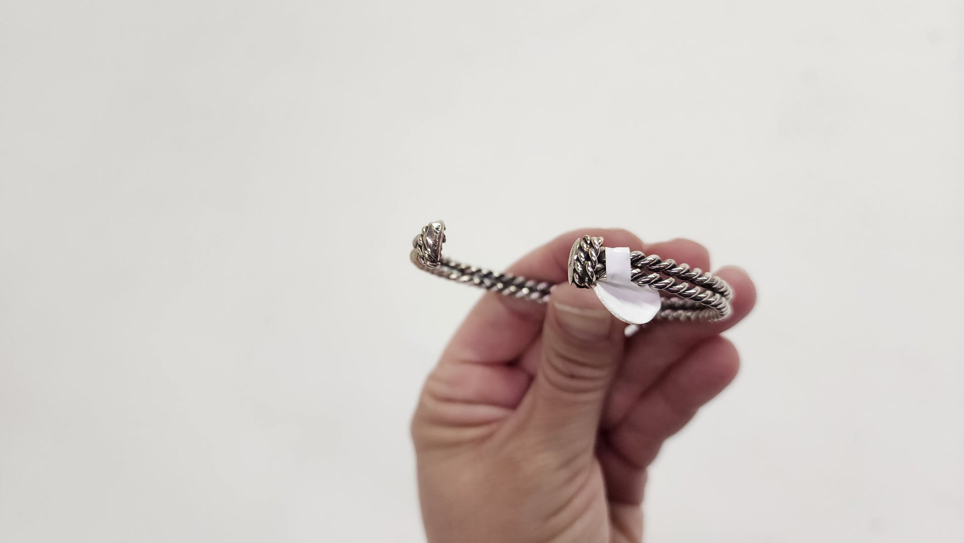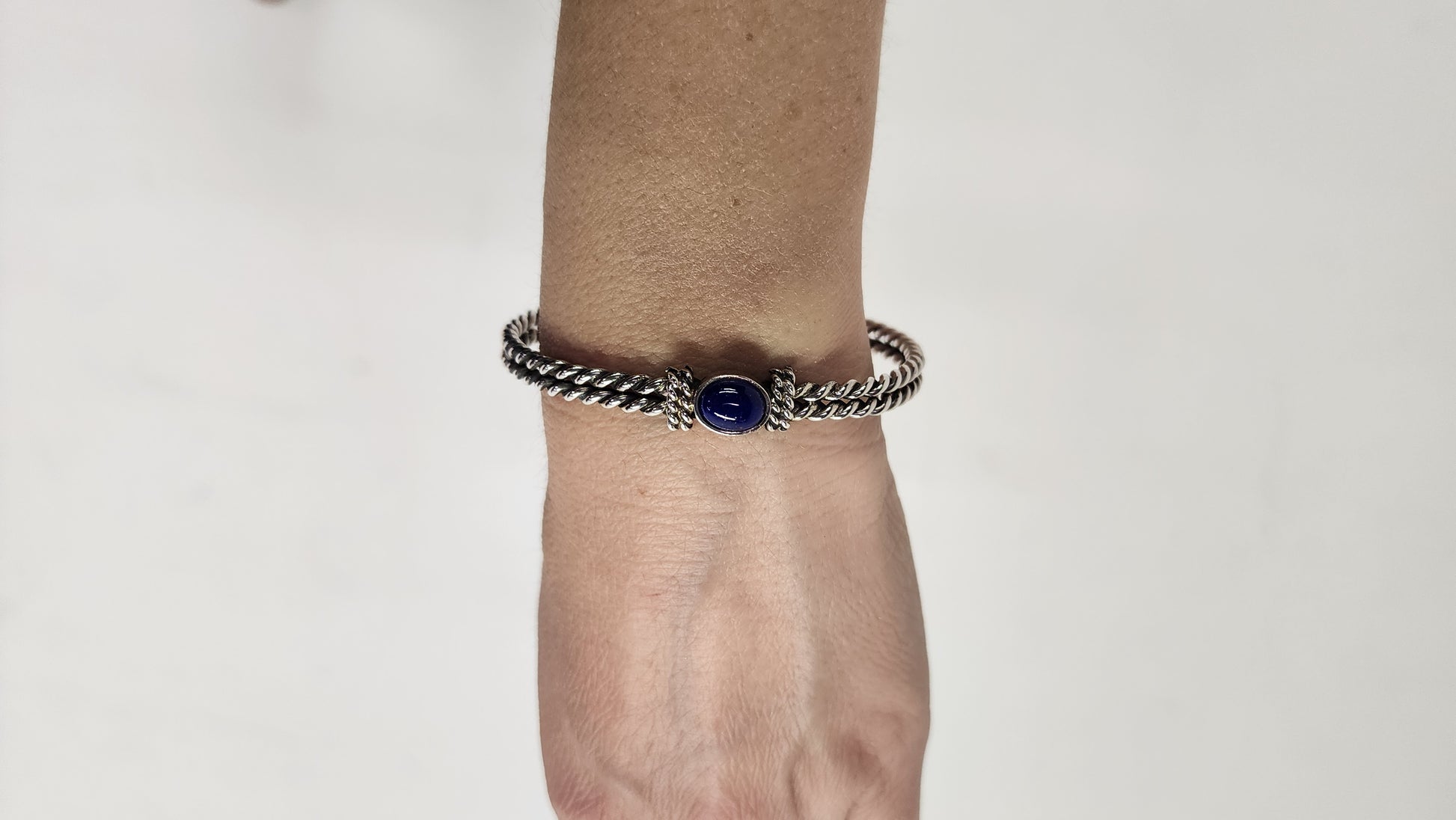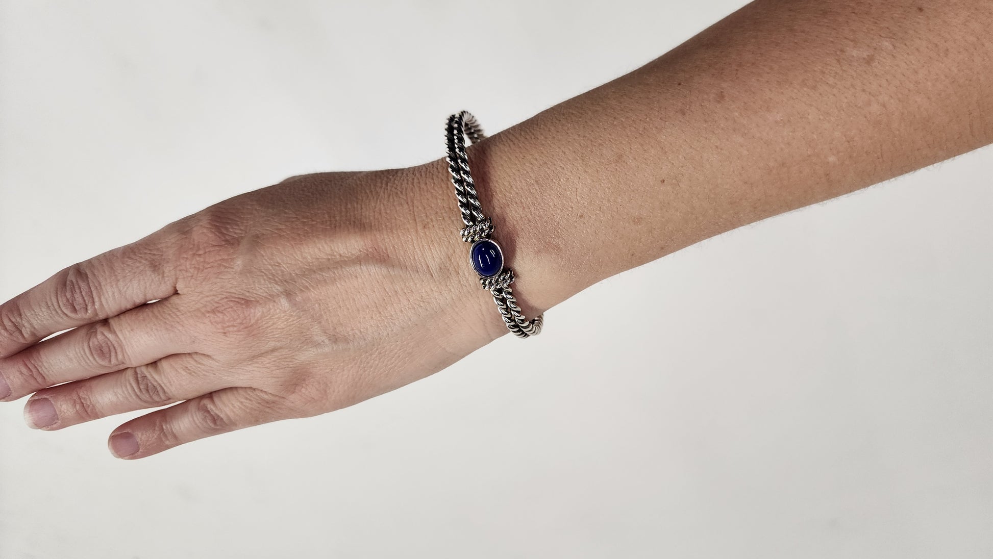 Handcrafted sterling silver rope cuff with lapis lazuli.