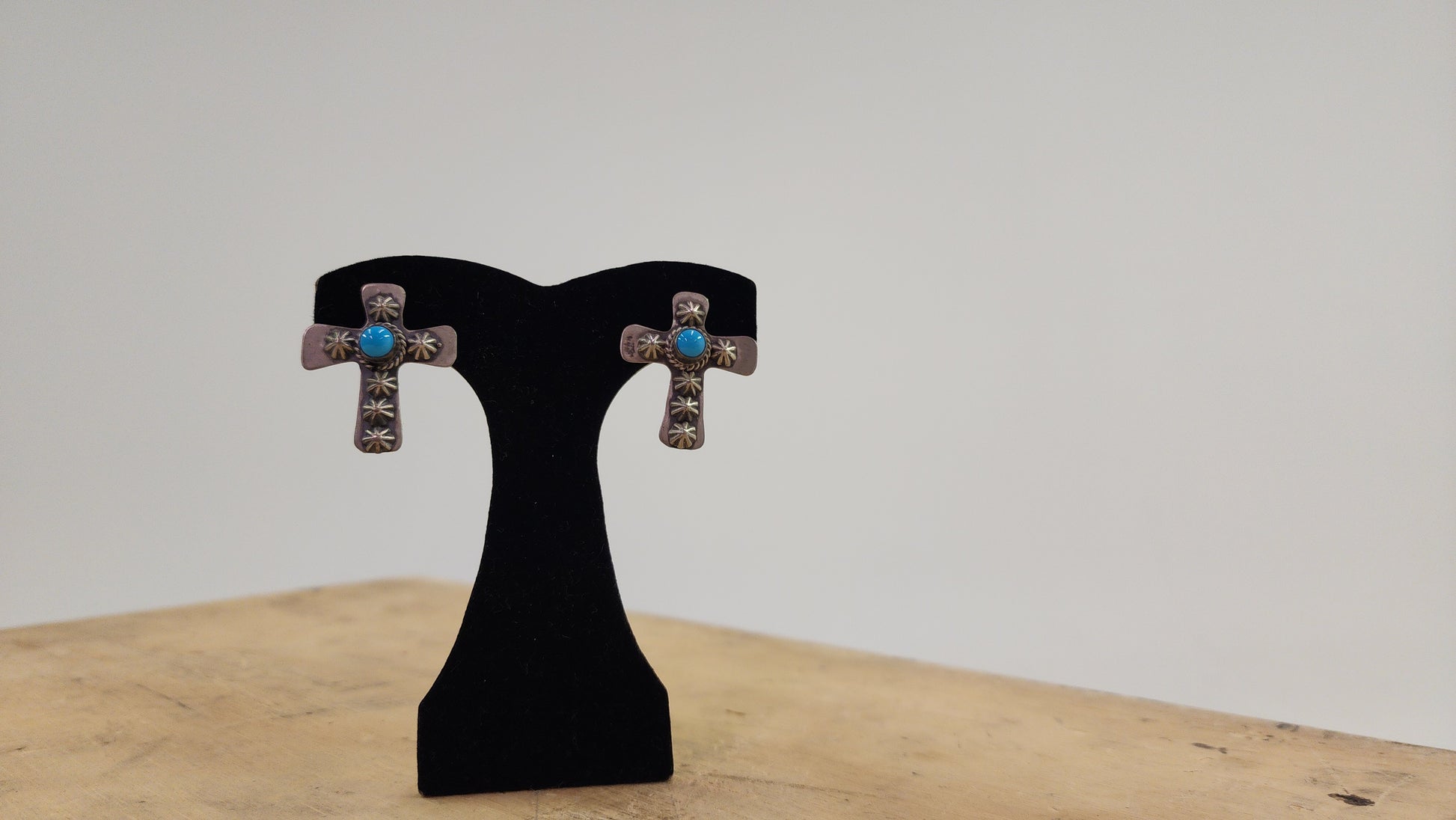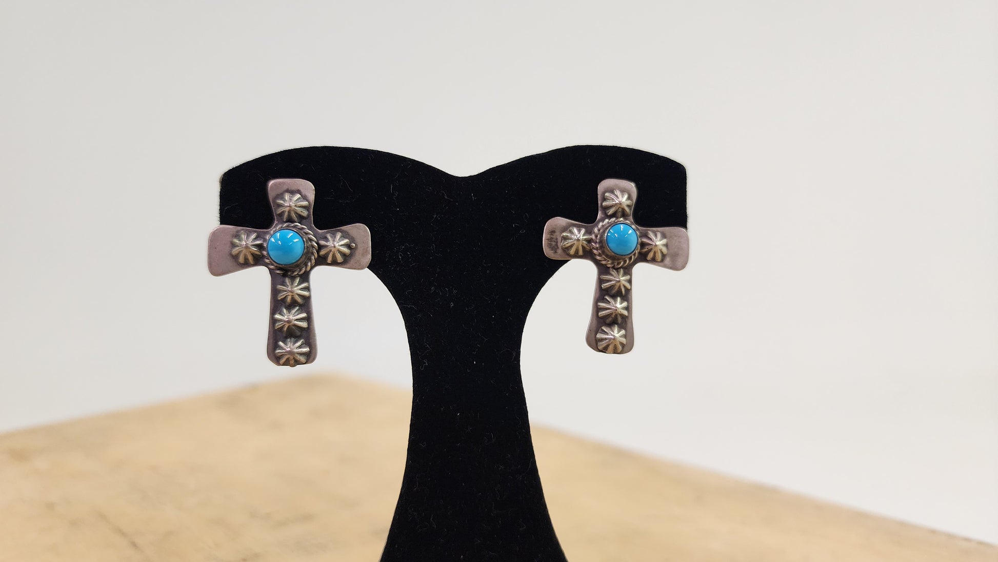 Native American handcrafted patina sterling silver and turquoise earrings with concha accents. Post backs and stamped by the artist.
