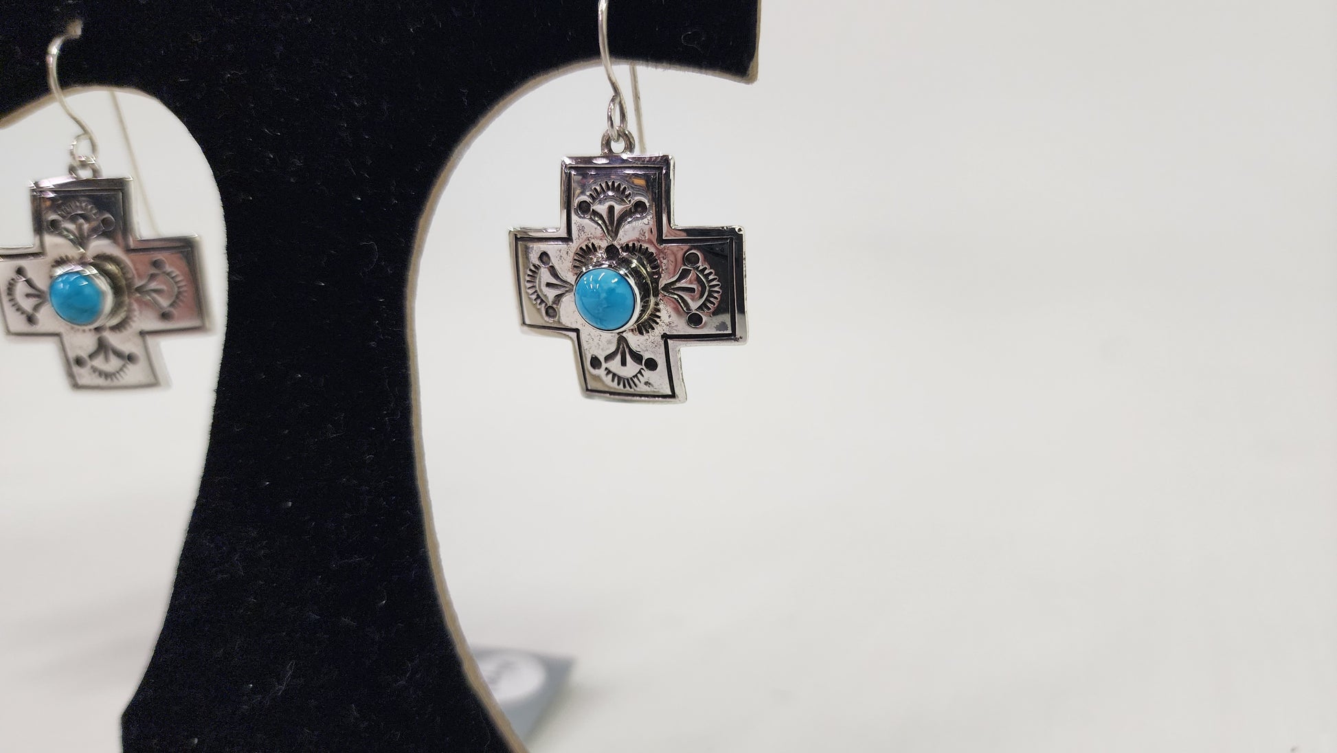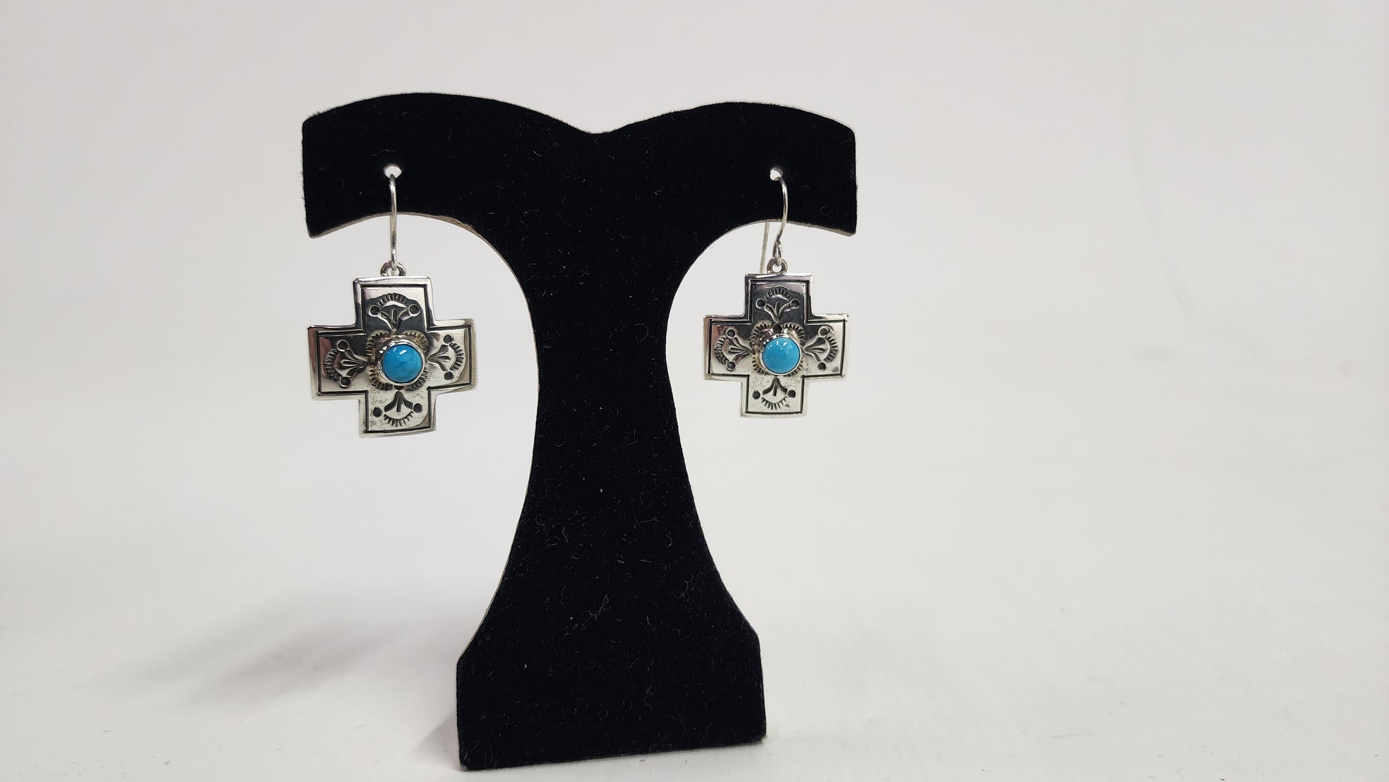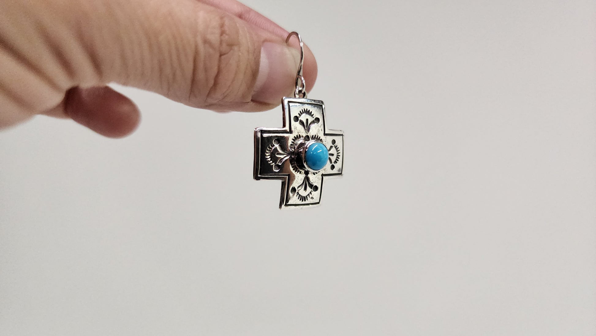 Native American handcrafted sterling silver and turquoise dangle earrings. Short cross earrings with beautiful detail. Light and easily will become your favorite everyday pair of everyday earrings. They go perfect with everything!
