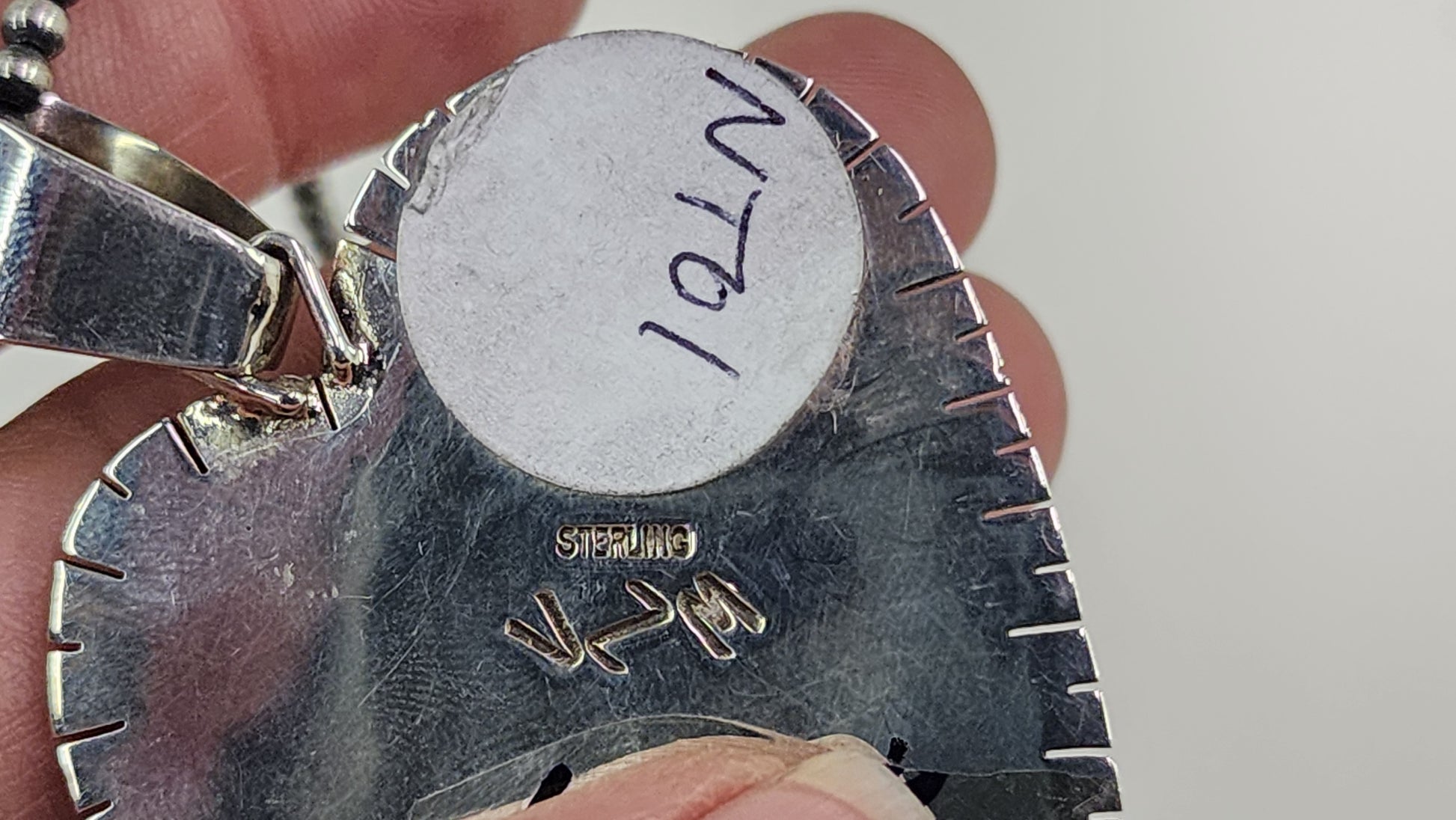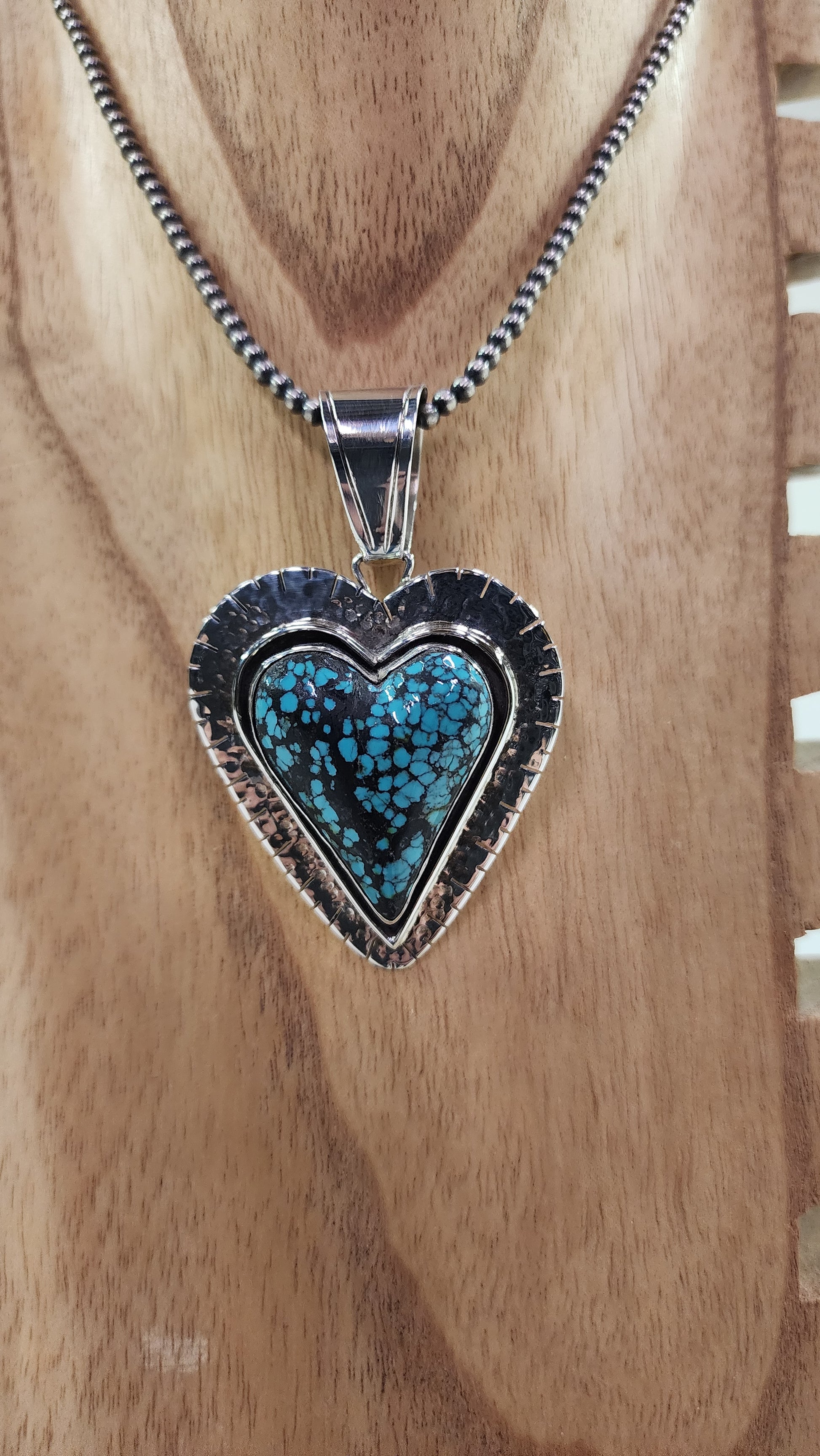 Native American handcrafter sterling silver and turquoise heart pendant. Stamped by the artist. Chain sold separately. The beautiful matrix in the turquoise really makes this pendant pop and stand out. It's a stunning piece.