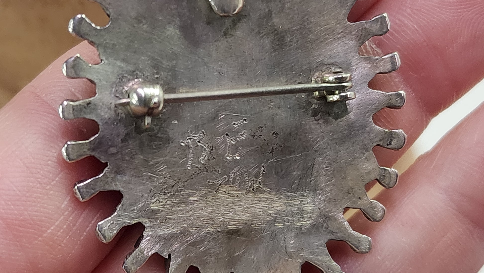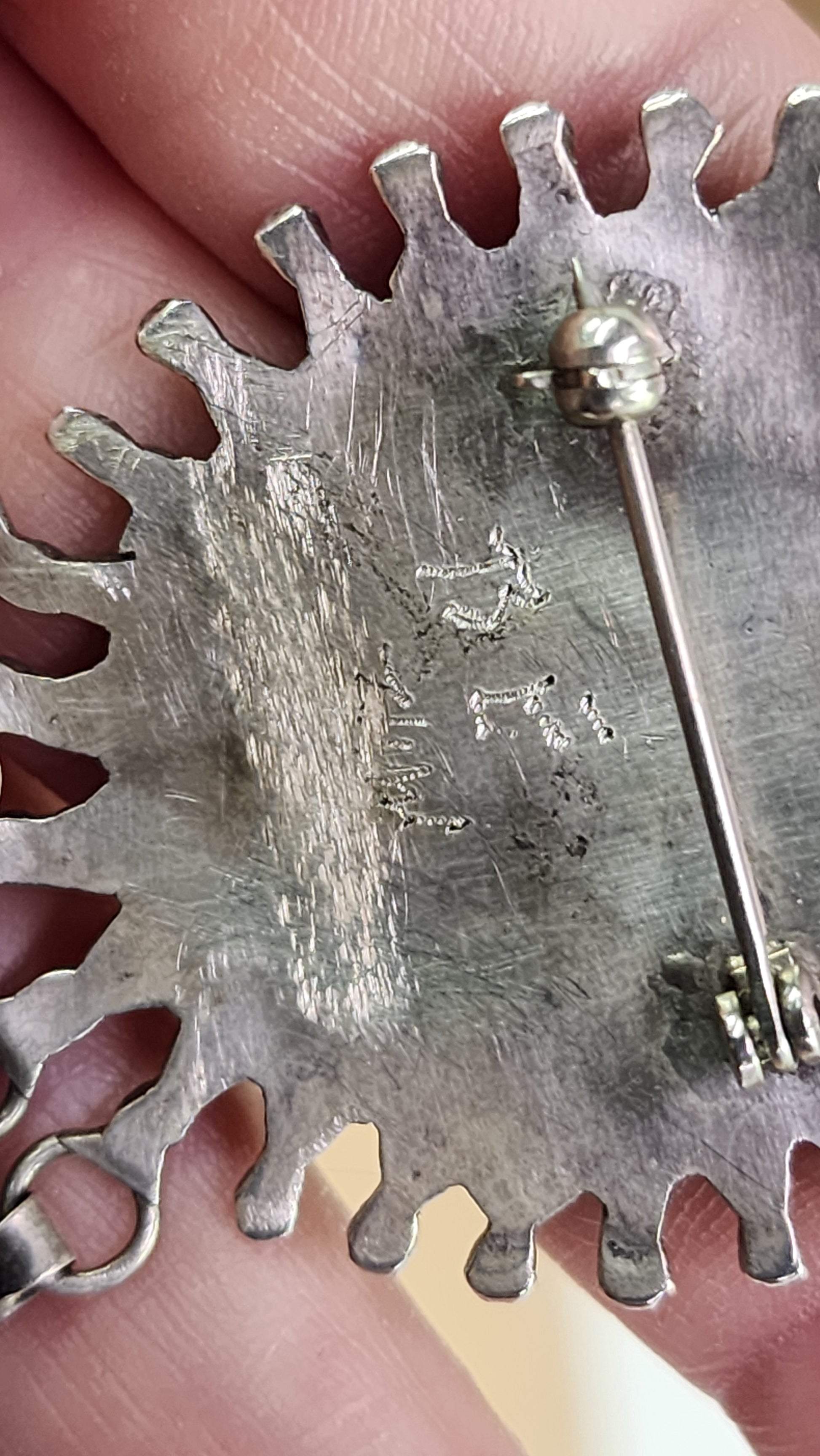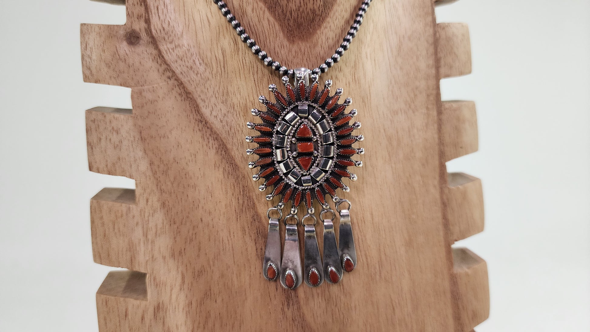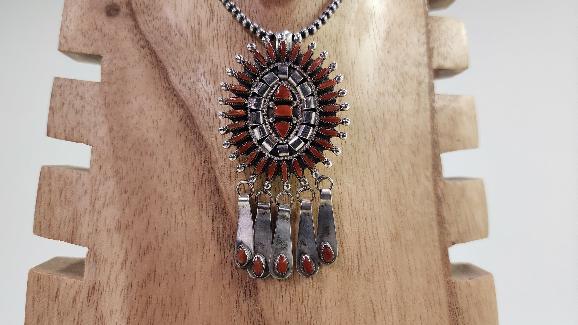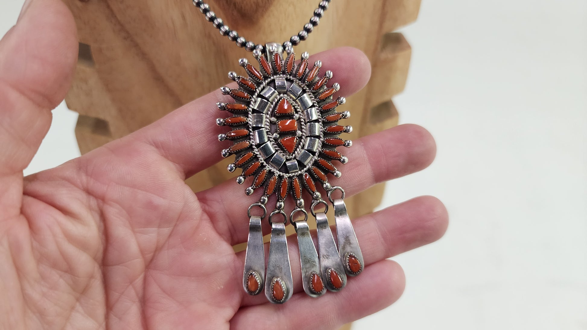 This one-of-a-kind pendant/pin is Zuni handcrafted and signed by the artist. It is made of sterling silver and coral. Needlepoint and Petit Point is a delicate and beautiful style of jewelry from the Zuni Tribes. It is classy and elegant in the most traditional way. The bail on the pendant can be lifted to fit larger chains. This is an exceptional piece